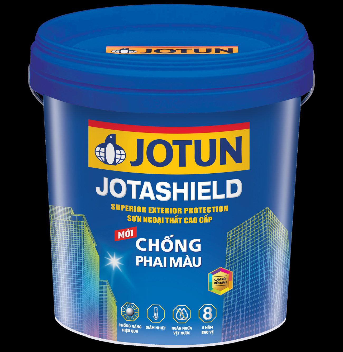 Jotashield Chống Phai Màu được tạo ra từ Công nghệ chất tạo màu tiên tiến nên có khả năng chống sự hấp thụ và phản xạ tia tử ngoại mặt trời, tránh làm màng sơn bị phai màu và bền đẹp theo thời gian. Màu sắc của sản phẩm được các chuyên gia Jotun nghiên cứu và lựa chọn kỹ lưỡng góp phần làm đẹp cho ngôi nhà thân yêu của bạn. Đồng thời ngăn chặn vệt nước giúp ngôi nhà của bạn luôn sạch như mới trong một thời gian dài.